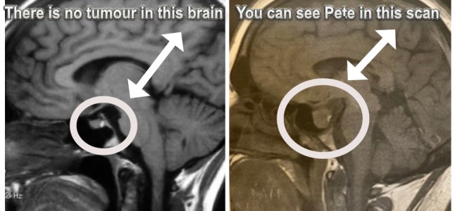 The tumour is between a pea and a peanut and is on my pituitary gland at the base of my brain. That is why I named him Pete. (It is also difficult to fear something named Pete. I dated a couple of Petes—it’s not named after either of them.)